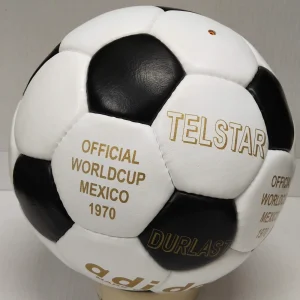 The Adidas Telstar was the official match ball of the 1970 FIFA World Cup in Mexico. It was the first World Cup ball to use the now-familiar truncated icosahedron for its design, consisting of 12 black pentagonal and 20 white hexagonal panels. The name came from the Telstar communications satellite, which was launched in 1962 and was the first to transmit live television signals across the Atlantic. The ball was designed to stand out on black-and-white TV broadcasts, which were still common at that time. The ball was made of leather and had a polyurethane coating that improved its water resistance and durability.