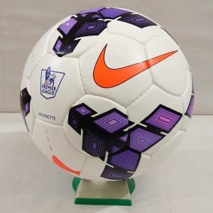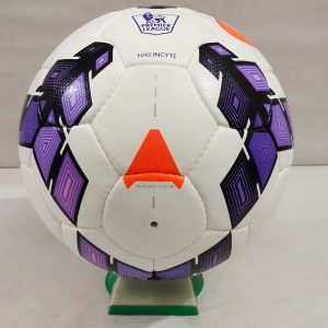 The Nike Incyte Premier League ball was the official match ball for the 2013/14 season. It featured a bold design with purple graphics and a vibrant orange Nike swoosh, incorporating Nike’s RaDaR (Rapid Decision and Response) technology to enhance visibility on the pitch. The ball was praised for its innovation and performance, including a micro-textured casing for accurate flight and a five-layer construction for optimal touch.